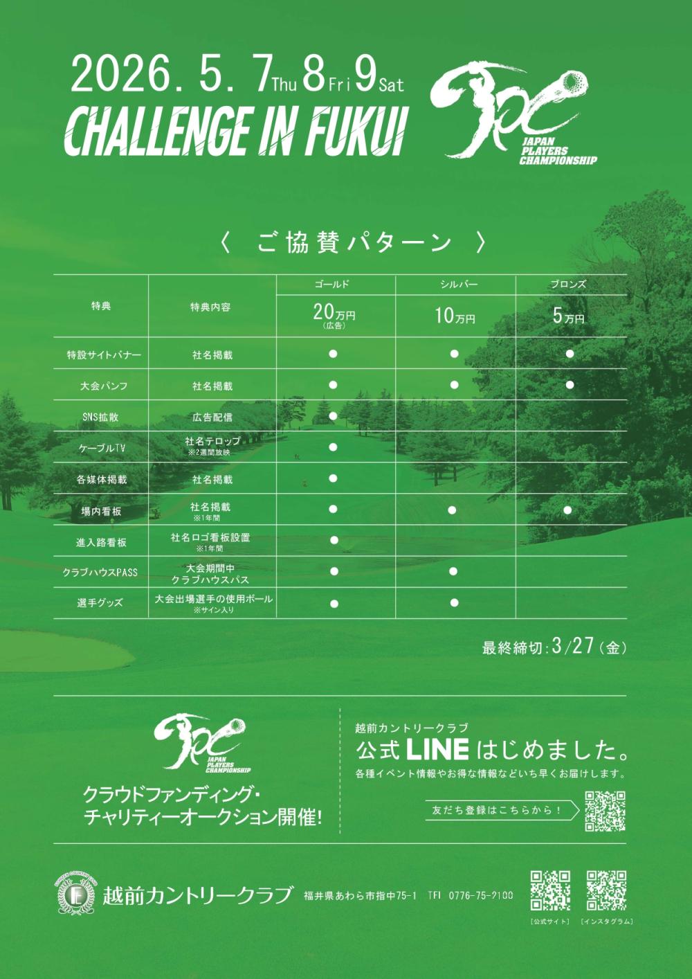 株式会社越前カントリークラブは、2026年5月7日から9日までの3日間、当ゴルフ場にて「JAPAN PLAYERS CHAMPIONSHIP CHALLENGE ㏌ FUKUI」を開催いたします。